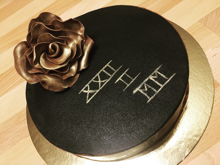 Réalisé pour un anniversaire. Génoise à la vanille de Madagascar et ganache chocolat noir. Décor en pâte à sucre, chocolat, feuille azyme et impression alimentaire.