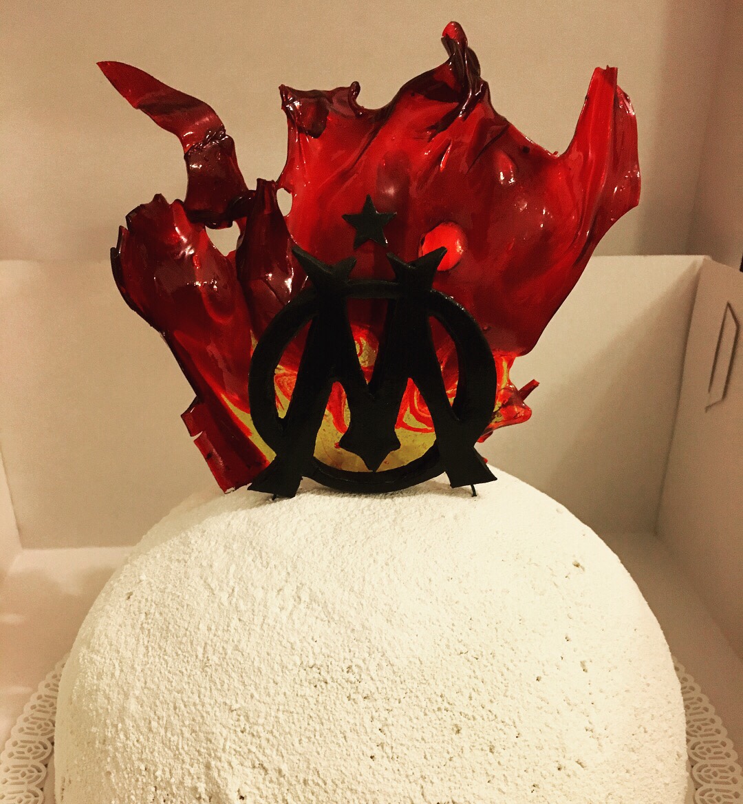 Royal Vanille/Chocolat Blanc réalisé pour un anniversaire au couleur de l’Olympique de Marseille. Inspiré du grand cru vanille de Philippe Conticini.
