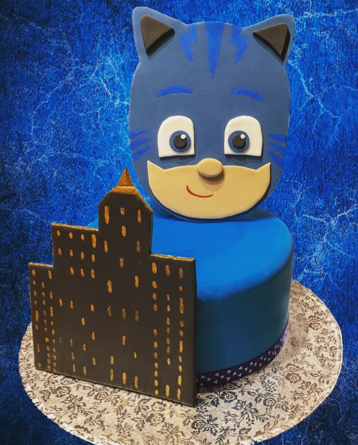 Molly Cake au cacao et crème au beurre à la meringue italienne au chocolat noir. Décor en pâte à sucre et peinture alimentaire.